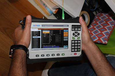 Me measuring the optic fibre at a friends house to check if his operator (Vodafone - "fibre to home") is better than mine (NOS - "coaxial")... With the S7200 I can measure ANY signal!